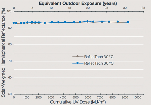 The graph below shows that after receiving the equivalent cumulative UV dose of over 35-years of outdoor exposure, no degradation and no loss in reflectance were measured in samples of ReflecTech.