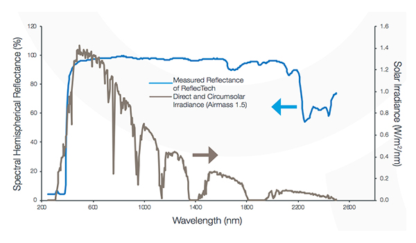 ReflecTech mirror film has high reflectance in the wavelength range important for harnessing sunlight for thermal power production. Hemispherical reflectance is plotted on the left axis while the ASTM sunlight standard is plotted on the right axis, both as functions of wavelength. The specular reflectance 94%.