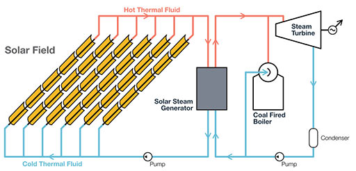 Solar generated steam may directly supplant steam from a coal boiler or solar energy is used to preheat feedwater to steam generator.