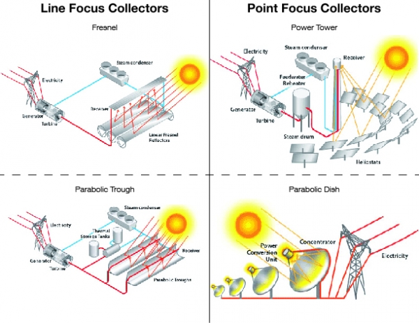 Line focus collectors include linear Fresnel and parabolic trough. Point focus collectors include power tower and parabolic dish technologies. Of these technologies, parabolic trough has the longest commercial track record and the most financed, installed, and operational plants in the world. 95% of all operational CSP projects today use parabolic trough technology.