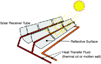 CSP technology is composed of a highly reflective surface (i.e. a mirror), that redirect a large area of sunlight onto specified point. In the case of parabolic trough technology, each module unit is composed of a single parabolic mirror and a receiver. The receiver is positioned so that when the sun hits the mirror surface, the mirror redirects the sunlight into the receiver. Flowing within the receiver is a specialized Heat Transfer Fluid (HTF), such as oil or molten salt, that will absorb the thermal heat and be pumped to storage tanks or actively utilized.